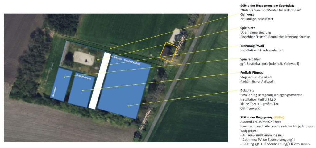 Zusätzlich soll der Umbau der in die Jahre gekommenen „Hütte“ in einen Aufenthaltsraum (Innenbereich nach Anmeldung und Außenbereich mit Grillstation jederzeit) für jedermann die Begegnung verschiedener Menschen – unabhängig von der Witterungslage - fördern und die Möglichkeiten zur Freizeitgestaltung der Dorfbewohner erweitern.