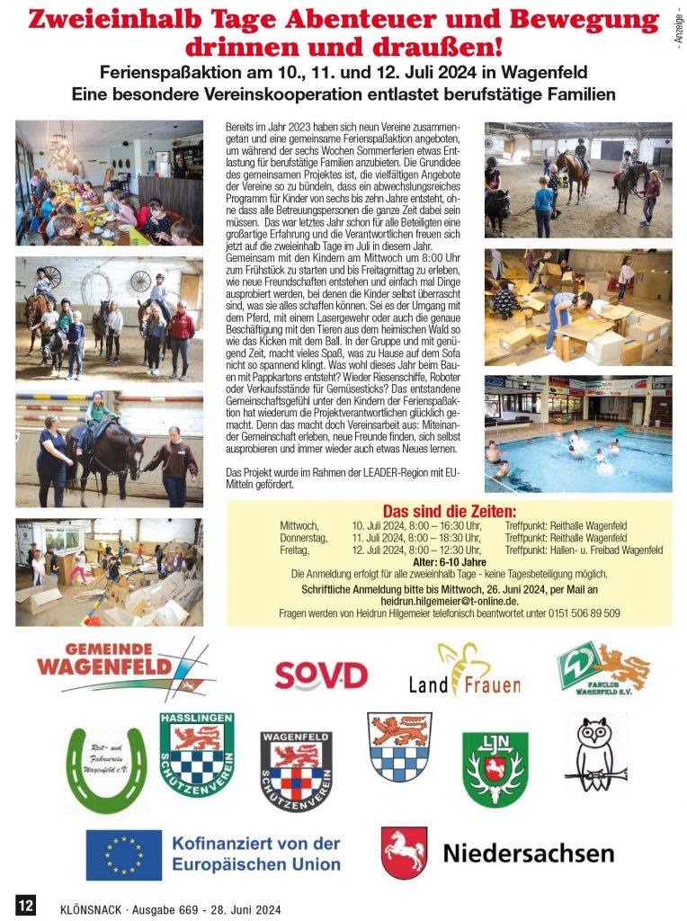 Um den Schüler*innen die Ferien zu verschönern und gleichzeitig den Eltern die Betreuung während der Sommerferien zu erleichtern, organisierte der Verein Ströher Dorfleben e. V. in Kooperation mit interessierten Vereinen aus Wagenfeld und Ströhen in den Jahren 2023 und 2024 die Ferienspaßaktion in Wagenfeld und Ströhen.