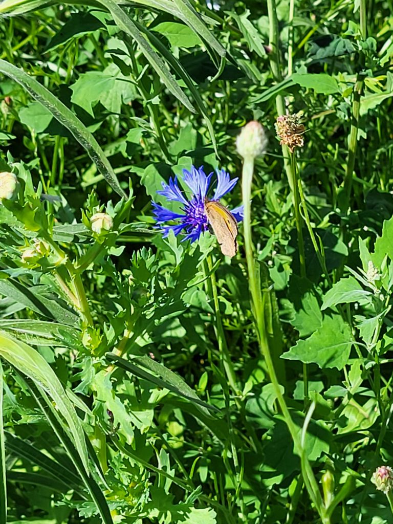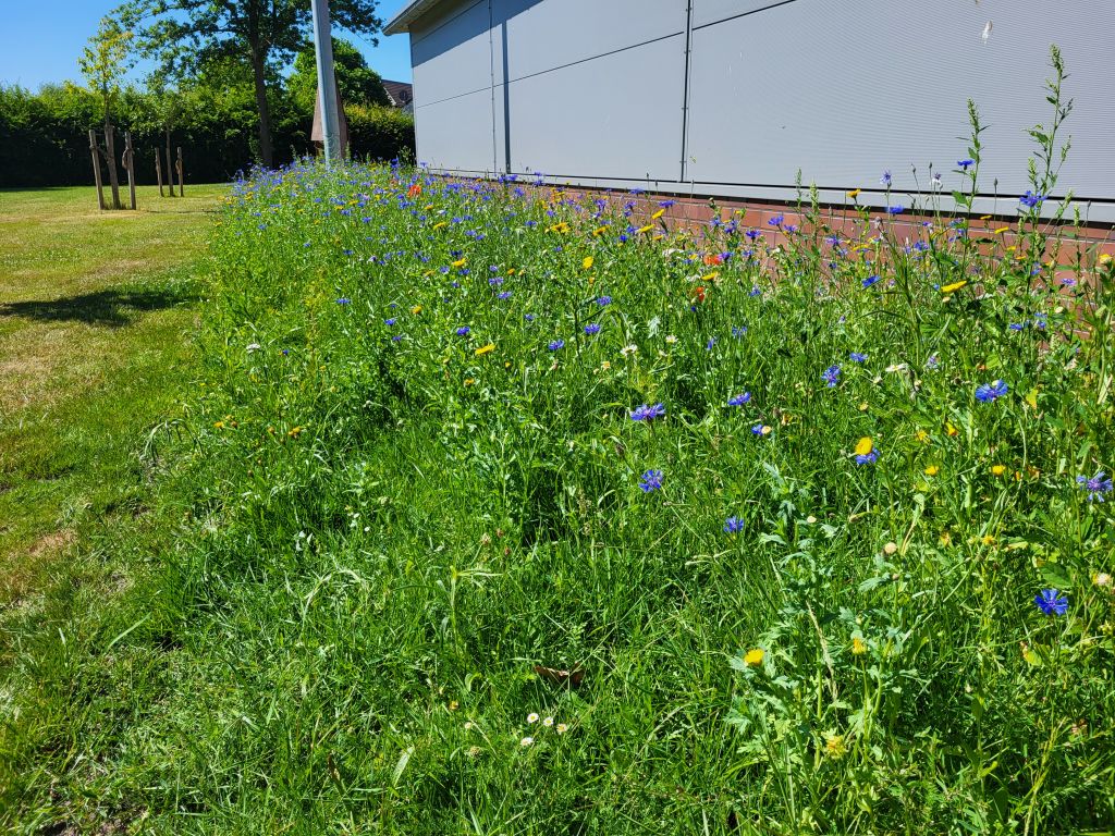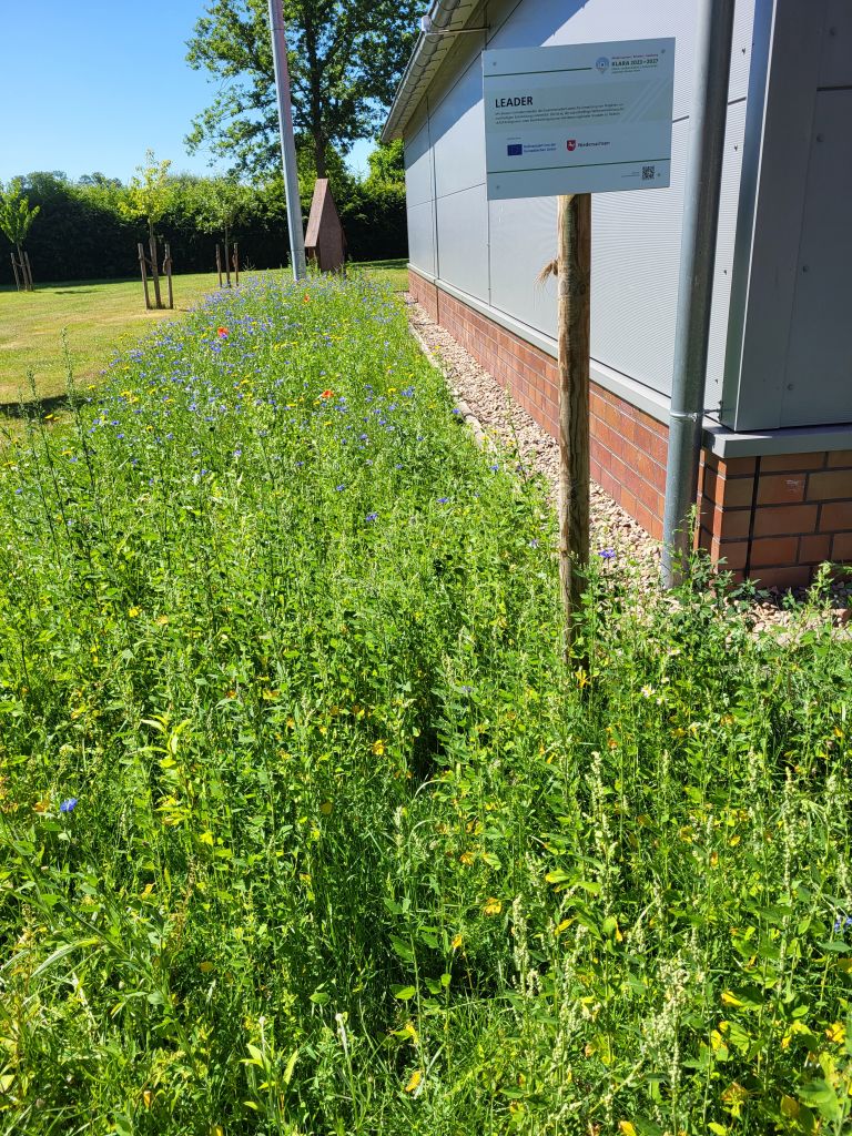 Zudem wurde neben den bereits auf der Fläche stehenden Obstbäumen und dem Insektenhotel eine Blühwiese angelegt, um die Biodiversität zu erhöhen und den Insekten ein zusätzliches Nahrungsangebot zur Verfügung zu stellen. Die Aussaat der Blumen erfolgte im Frühjahr in Kooperation mit der Naturpark Schule Ströhen, wobei die Schülerinnen und Schüler vieles über Nachhaltigkeit und die Natur lernen konnten. Mitlerweile steht die Blühwiese in voller Blüte und bietet den Insekten reichlich Unterschlupf und Nahrung.