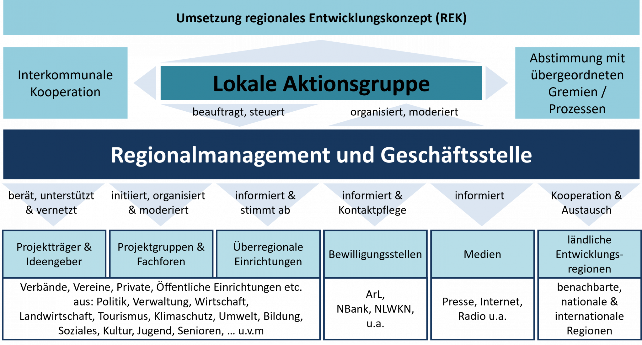 Unterstützt wird die LAG von einer Geschäftsstelle und einem Regionalmanagement, die zudem auch für mögliche Projektträger*innen zur Verfügung stehen. Die folgende Abbildung verdeutlicht die Prozessstruktur.
